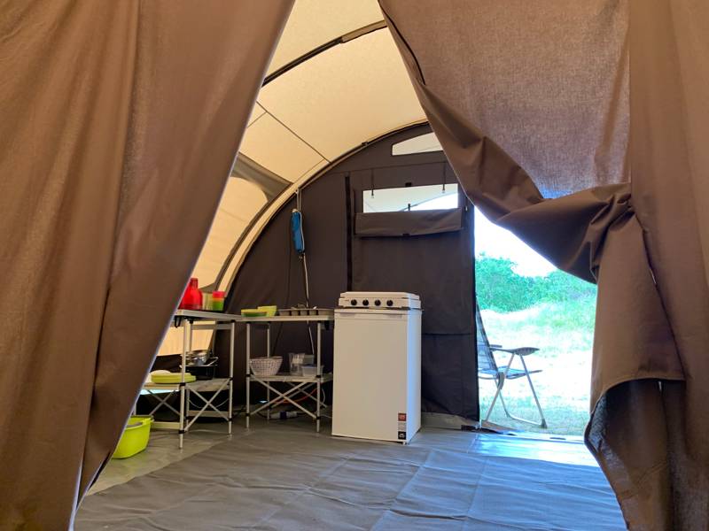In één van de drie slaapcabines staat een tweepersoonsbed. In de andere cabines staan één-persoonsbedden. De spiraalbedden zijn voorzien van schuim matrassen. In de tent staat een keukentje met koelkast en gascomfort.